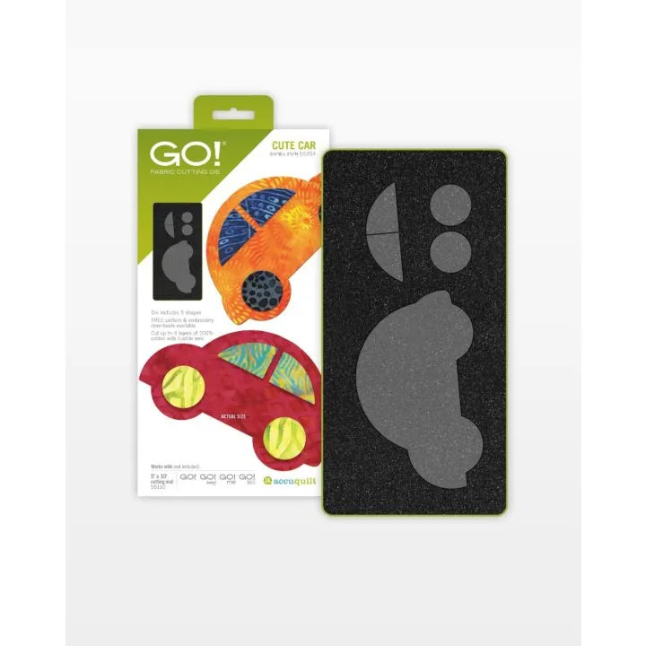 Cute as a button, the GO! Cute Car die makes quick work of cutting this adorable car. It has a fun bubble shape plus window and wheel details that would be tricky to cut by hand. Compatible with the AccuQuilt GO! or GO! Baby Fabric Cutter and perfect for baby blankets, bags and décor. Apply fusible web to the wrong side of fabrics prior to cutting for quick and easy appliqué.