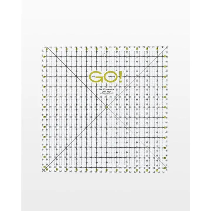 GO! Quilting Ruler-12 1/2" x 12 1/2"is a non-slip ruler with easy to read 1" grid with 1/8", 1/4" and 1/2" increments and 45° angle lines. and can be used with the GO! 45mm Rotary Cutter (55449) and GO! Rotary Cutting Mat-18" x 24" Double Sided (55448) for pre-cutting fabric strips for use with your AccuQuilt GO! Fabric Cutting System.