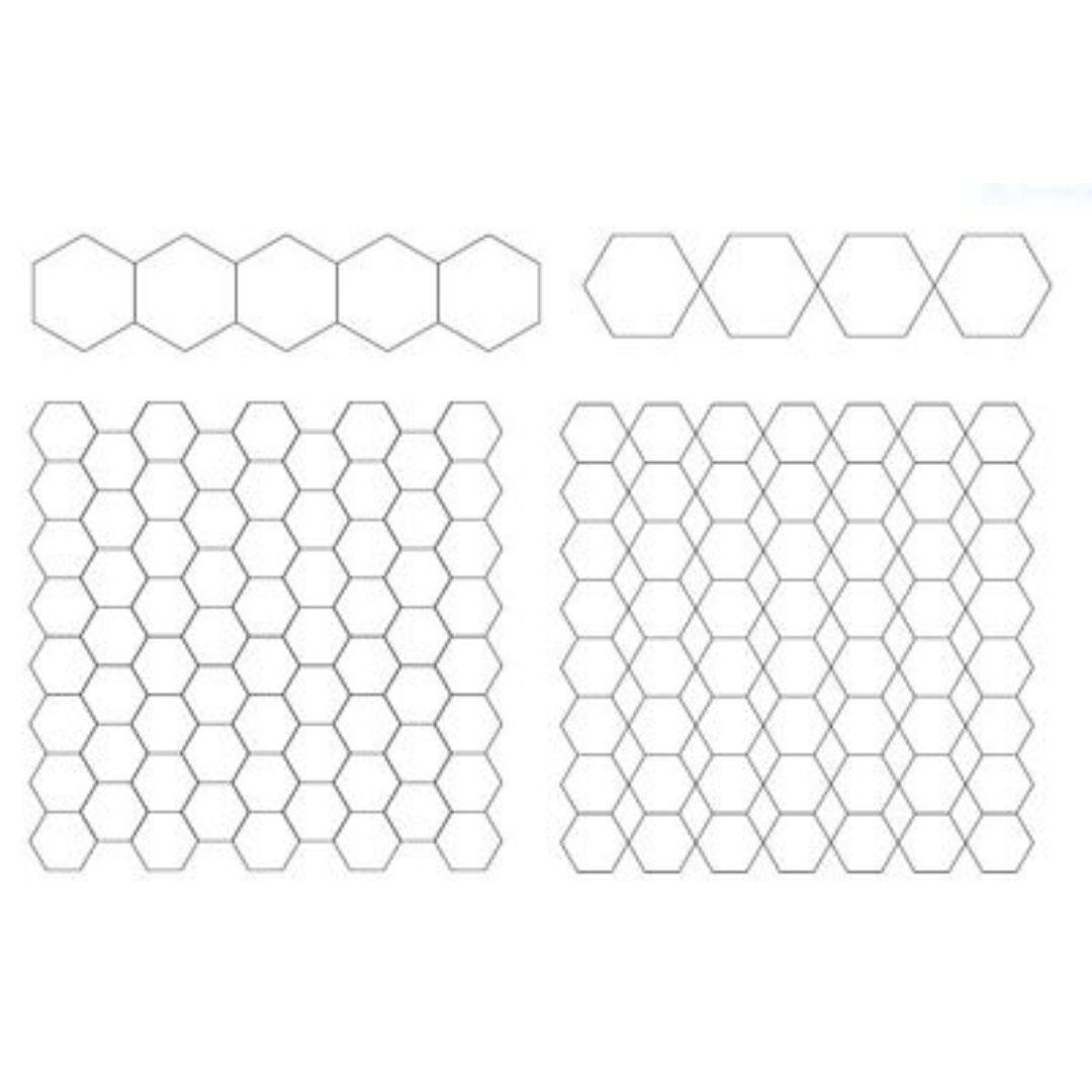 This set of 4 templates quilts hexagons that are 1”, 1-1/2”, 2”, and 2-1/2” in height. Because of their size, they are great for small and medium density designs.