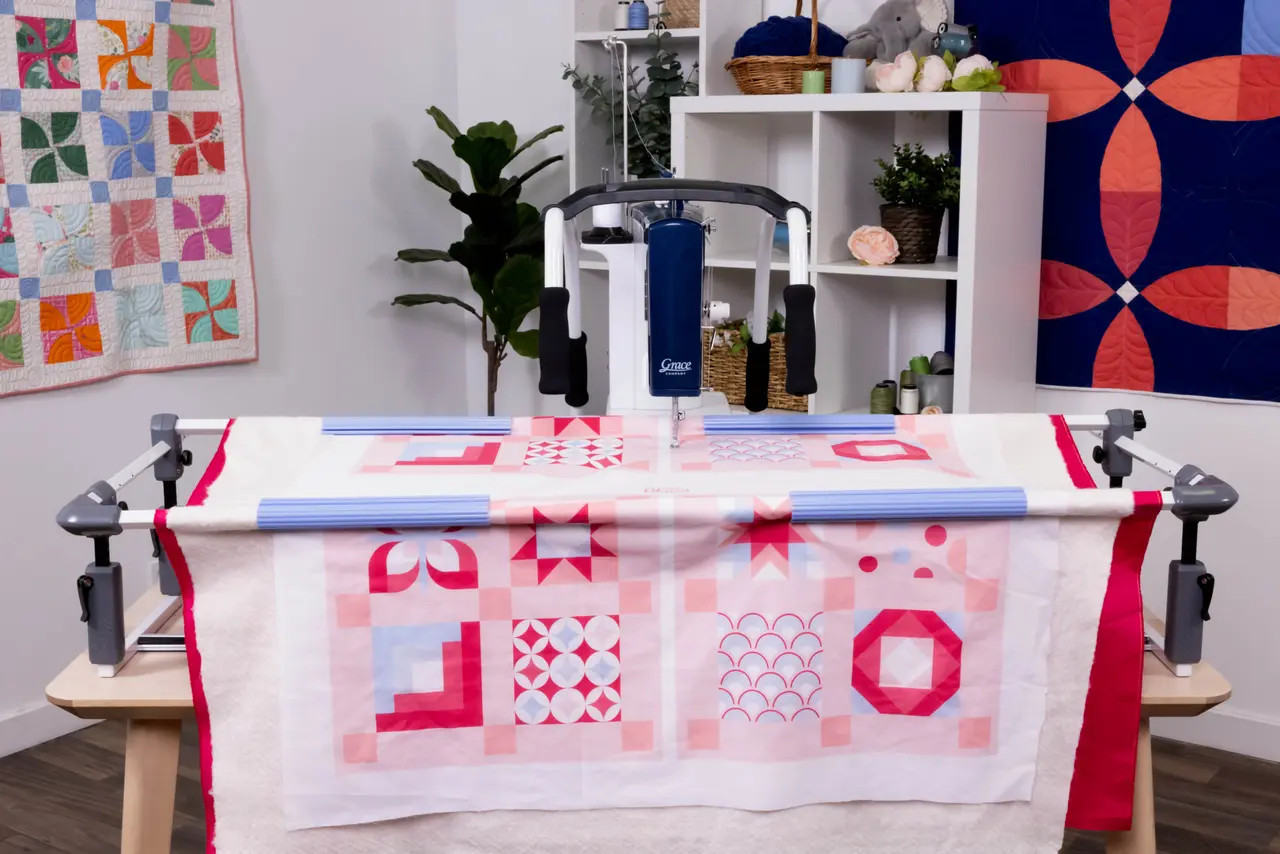 The Chariot Top Carriage is an amazing way to upgrade your Cutie Frame's current top-carriage. Why would you upgrade though? Having handles above your fabric allows for easier fabric management as you are zoning your quilt. Not only that, you are able to experience more closely what it is like to quilt on a long arm quilting machine!