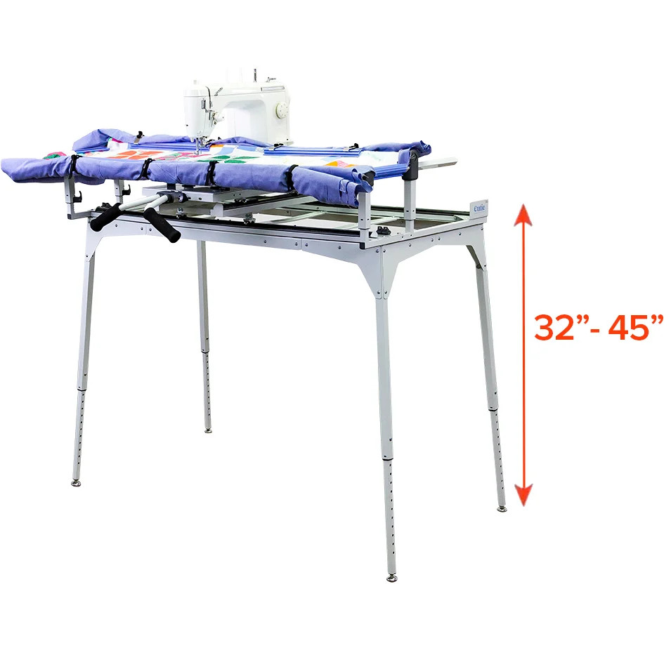 If you are looking to elevate your quilting setup, this is the accessory for you. Transform your Cutie into a freestanding quilting frame. Just attach your Cutie and enjoy instant stability and comfort as you sew. This accessory is height adjustable between 32 and 45 inches to accommodate all crafters. Includes table inserts for quilting with pantographs and Plastic Pattern Perfect templates from the back of the frame.