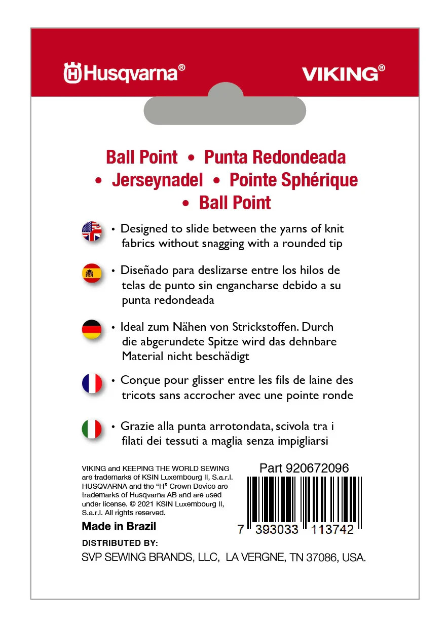 Perfect for light to medium weight knit and stretch fabrics, including microfiber, polyester and synthetic fabrics. With a rounded tip, this needle slides between the yarn in the fabric without snagging. For optimum performance, change your needle and/or type of fabric every 6 - 8 hours of sewing.