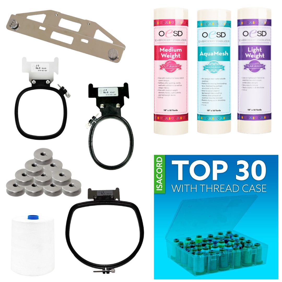 Accessories with the machine include needles, bobbins, set screws, cleaning tools, and everything necessary to set it up and start working. The new exclusive bonus bundle adds a special Anna Maria embroidery kit, a Janome extension table, a lettering hoop and hoop holder, a set of Janome jumbo metal bobbins, and a 20,000-meter cone of Janome white embroidery thread.