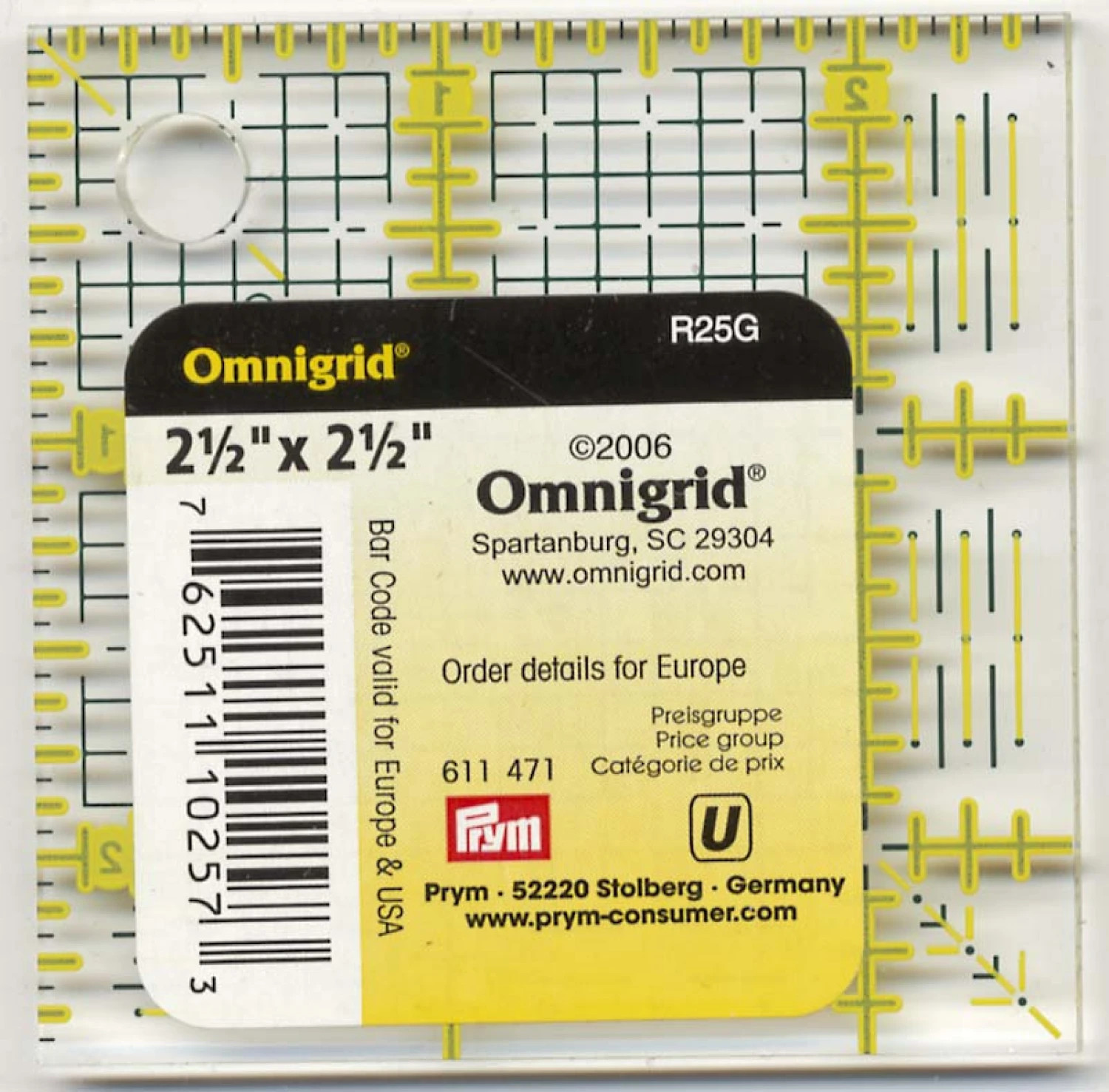 The Omnigrid 2.5in x 2.5in ruler with 1/16in markings is perfect template for miniatures and color wash quilts; it can also be used as a cutting template for squares and to check seam allowance accuracy; its petite size is ideal for hanging on a keychain or lanyard.