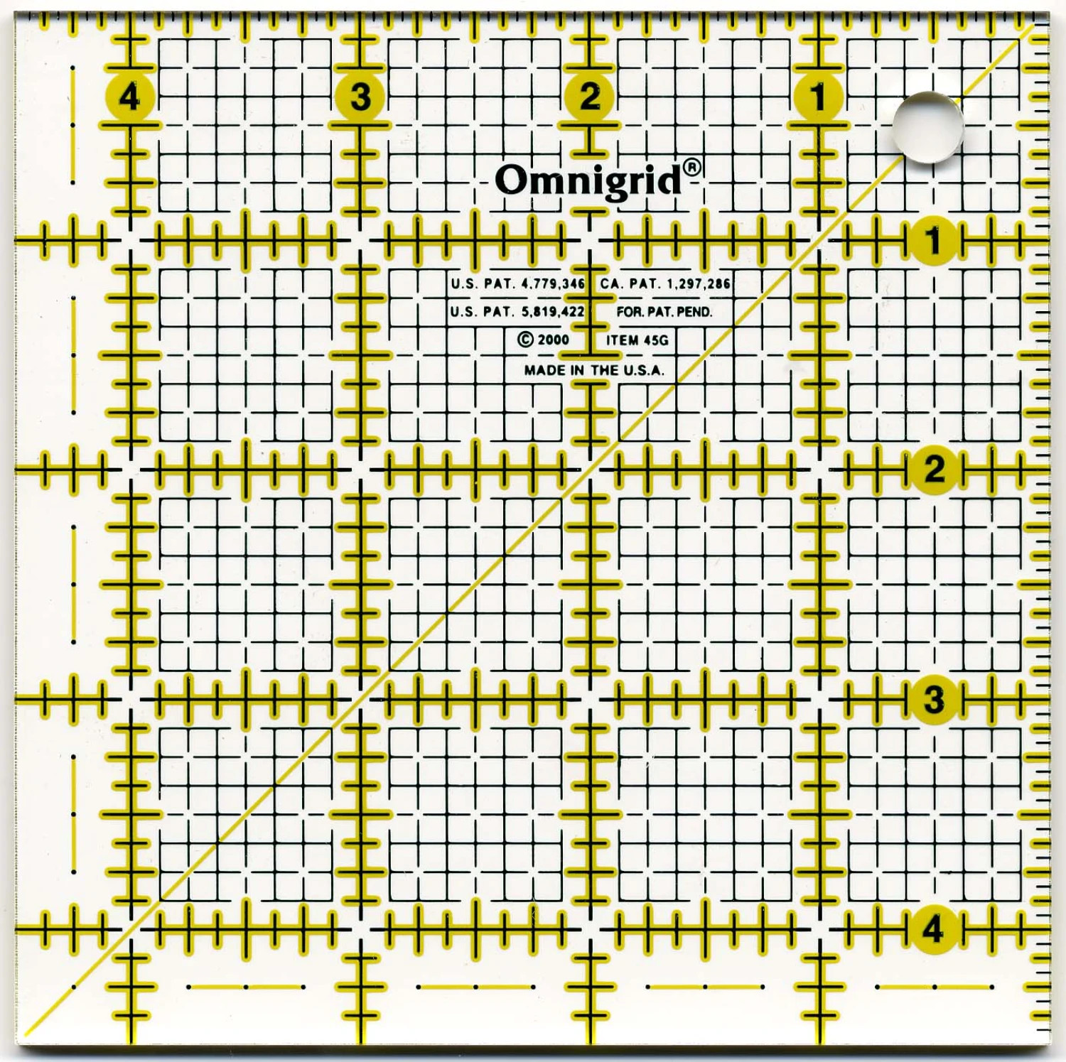 The Omnigrid 4.5in x 4.5in ruler with 1/8in grid features an extra 1/2in width for seam allowances and is a great template for 4in finished blocks; it is used to cut and square blocks 4.5in and under, and to trim and square foundation piecing blocks.