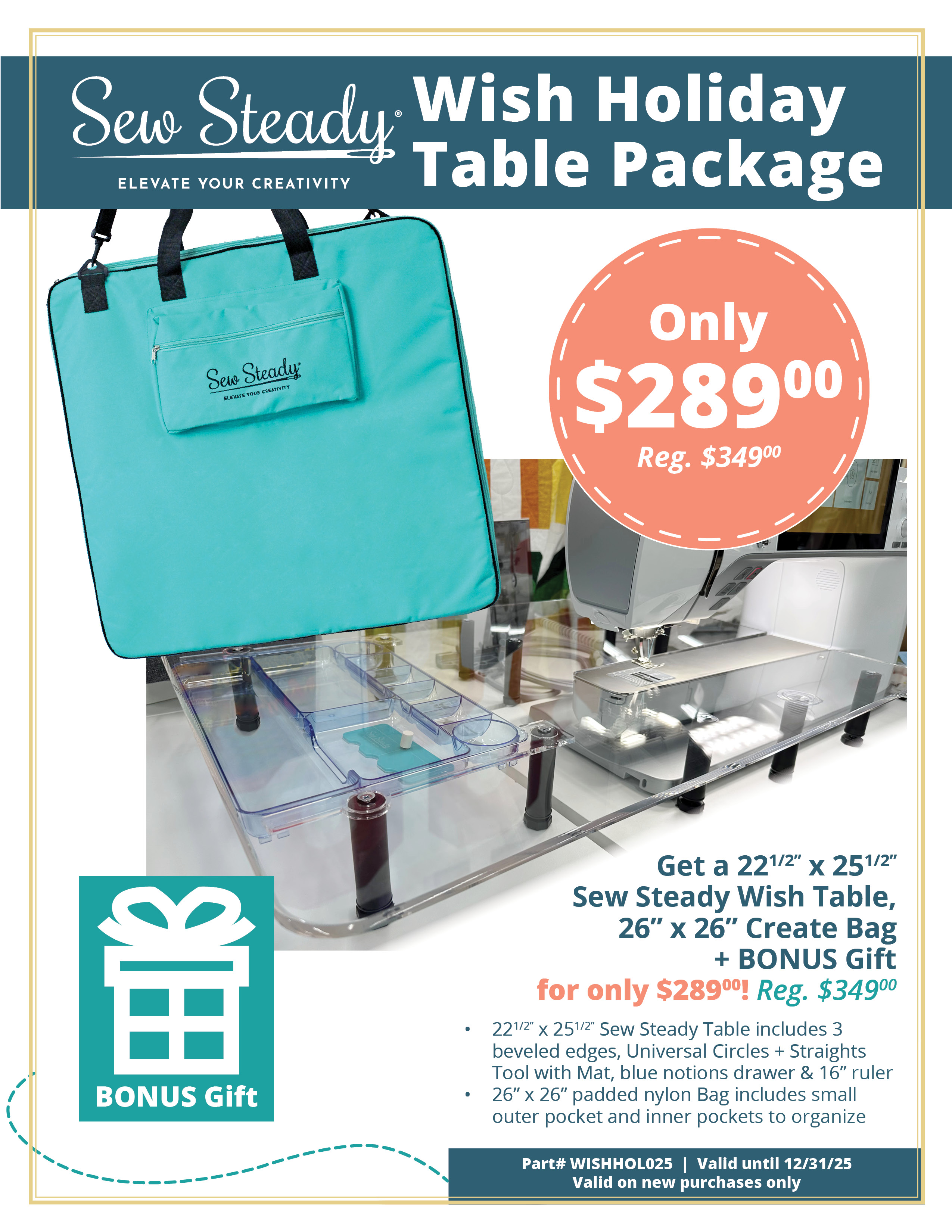 Product Description Holiday Special! Package Includes: WISH 22"X25" TABLE WITH 9"X14" BLUE DRAWER, CIRCLES AND STRAIGHTS TOOLS & MAT, 3 BEVELED EDGES, A 26" X 26" PROJECT, A TABLE TRAVEL BAG, AND A SURPRISE GIFT TO INSPIRE & CREATE!